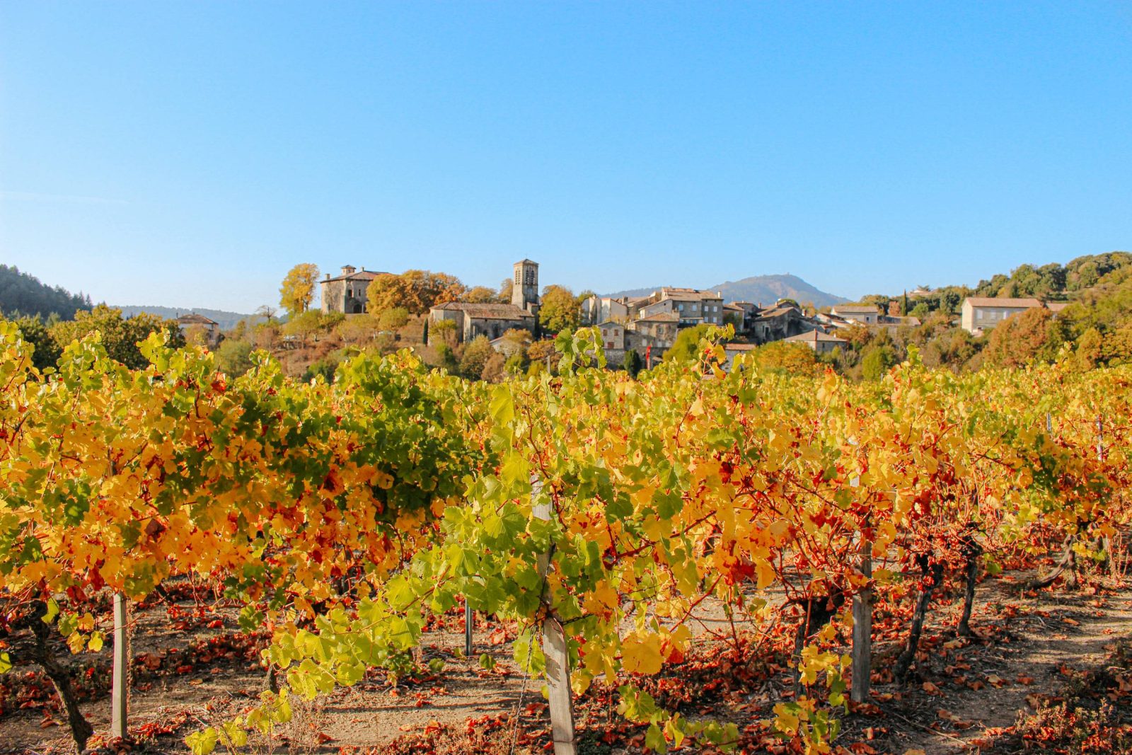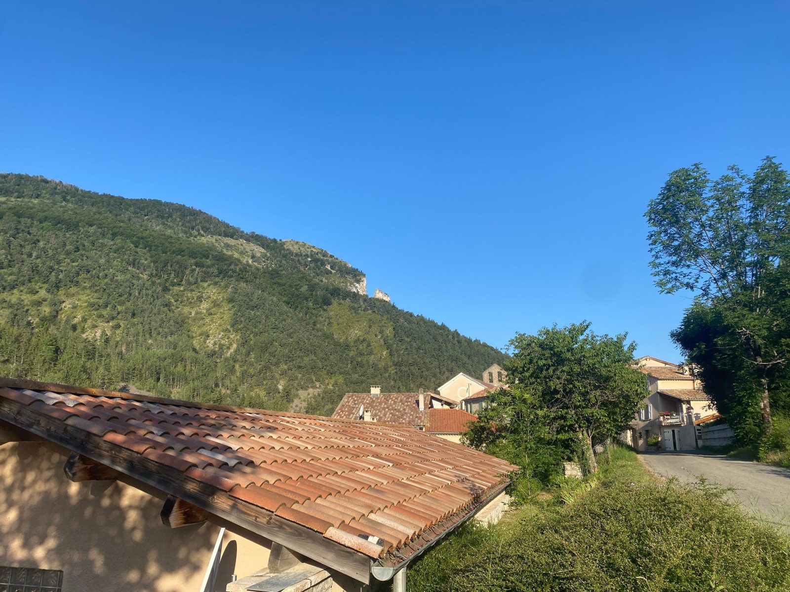1. Logères: [Ranc de Bal 2.2 km, Prunet 6.5 km] Continue along this path shaded by holm oaks. Continue straight ahead on this old, cobbled path, which occasionally reveals a few stones. As you climb, you'll have a fine view of the village of Rocher, the Vierge du Ranc Courbier and the south Ardèche. The path leads to a track, keep to your left. You will see the village of Prunet.