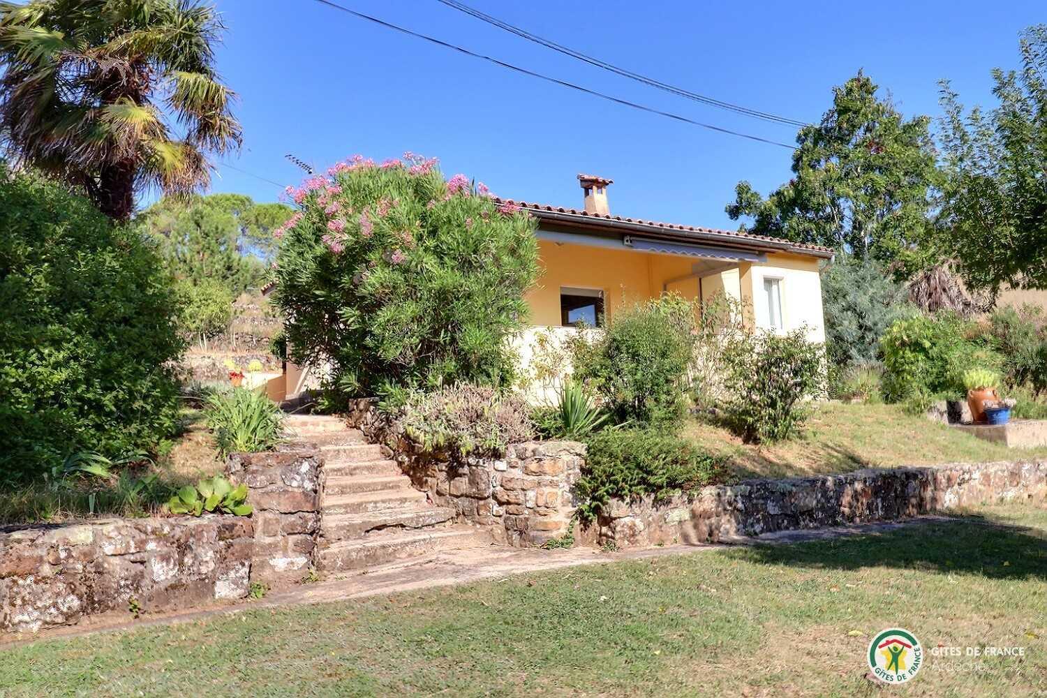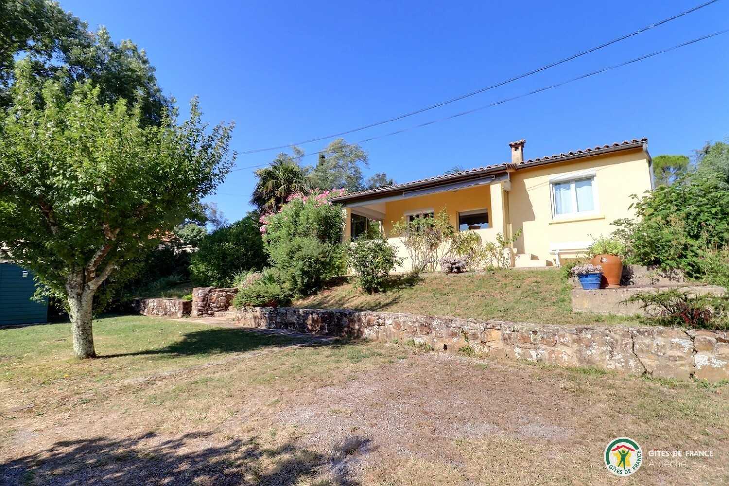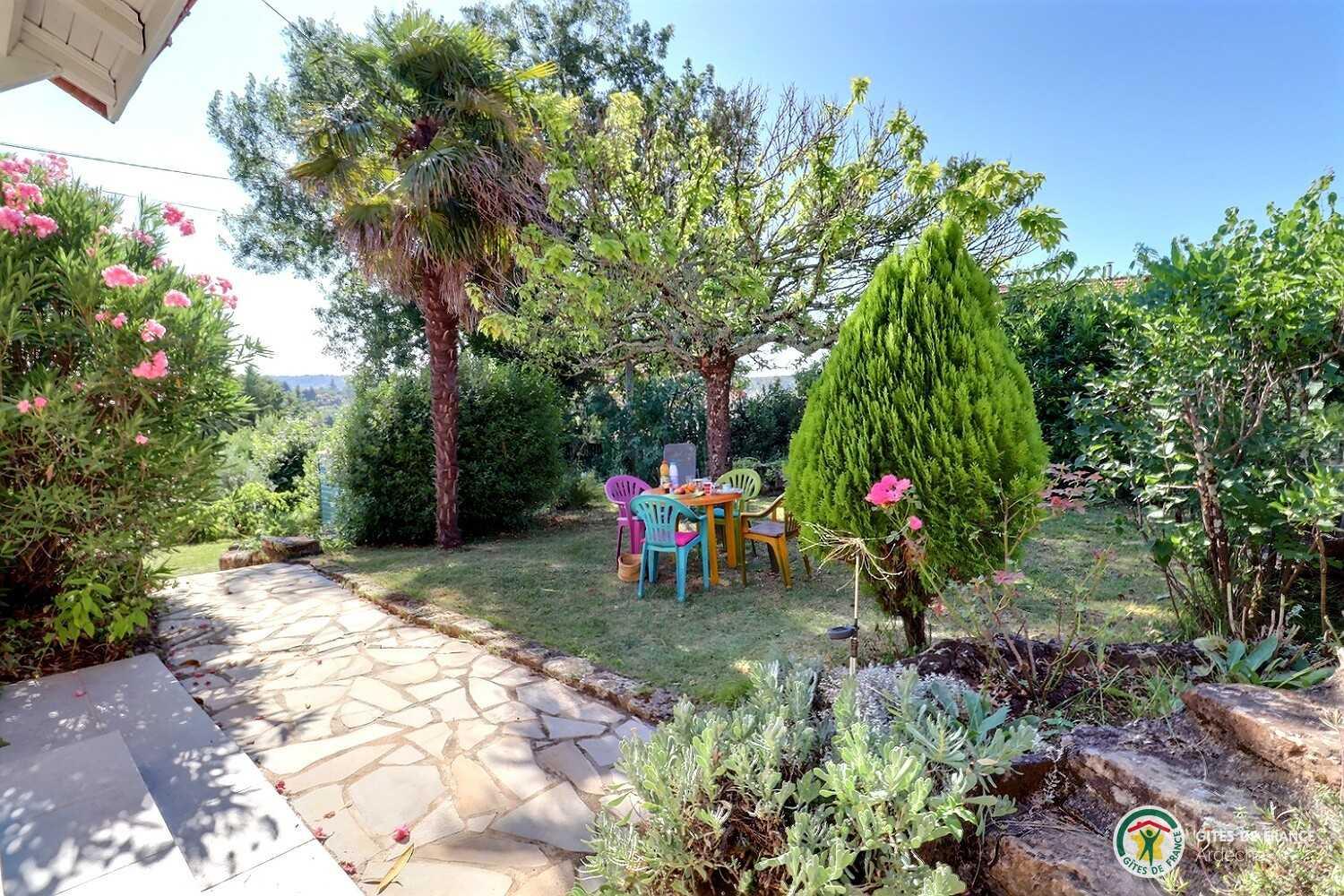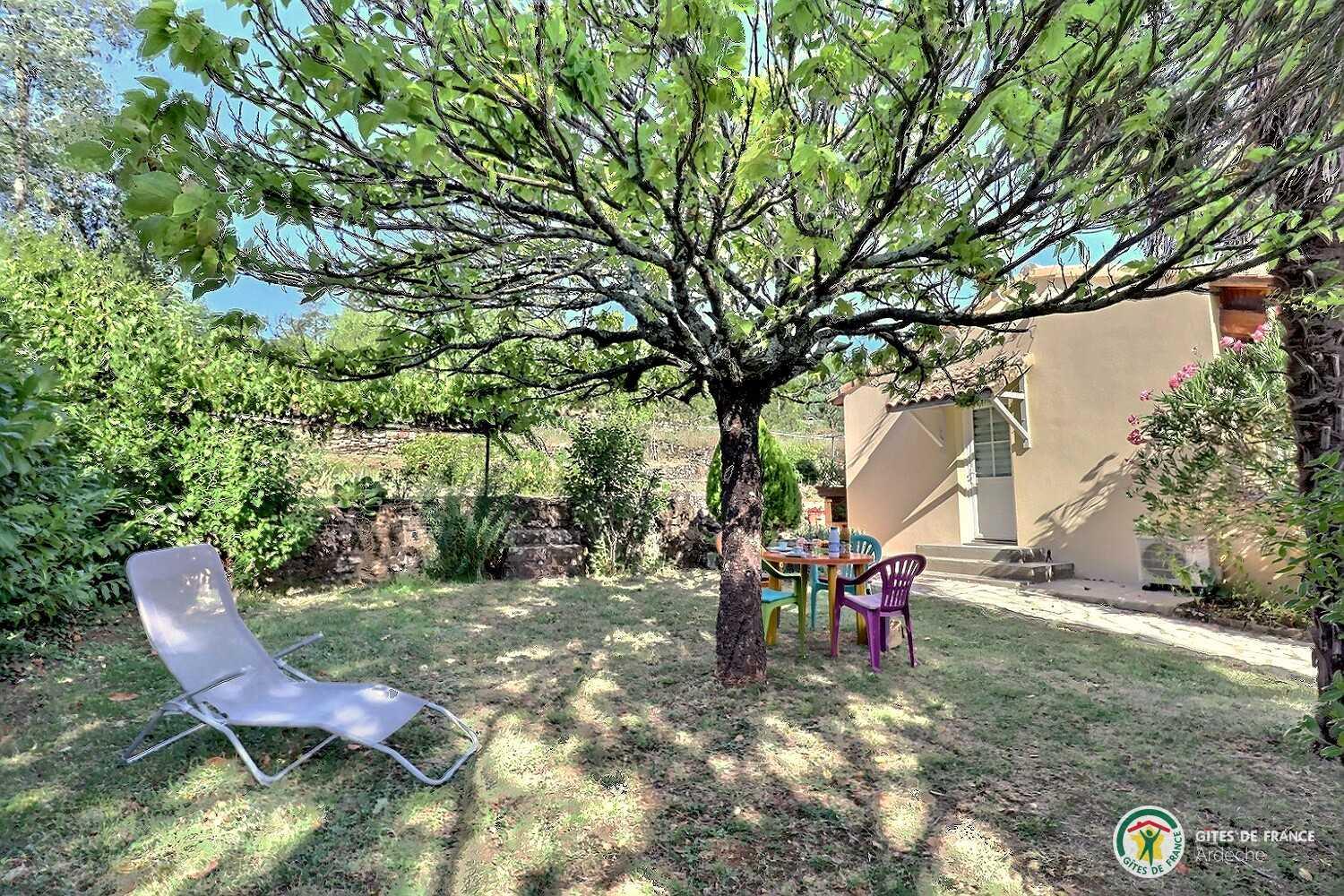 Self contained house with lovely fenced flower garden. Covered terrace with fine view of valley and village of Laurac (village centre 600m). Dining room with fitted kitchen area, lounge area (open fireplace), bedroom (double bed), shower room (shower cubicle), separate WC. Bed linen supplied. Electric heating. Car parking possible in fenced garden. Laurac is between the medieval village of Largentière (near Tanargue massif) and Balazuc (canoeing, swimming in river Ardèche). Peaceful, sunny setting with lots of walks on the doorstep.