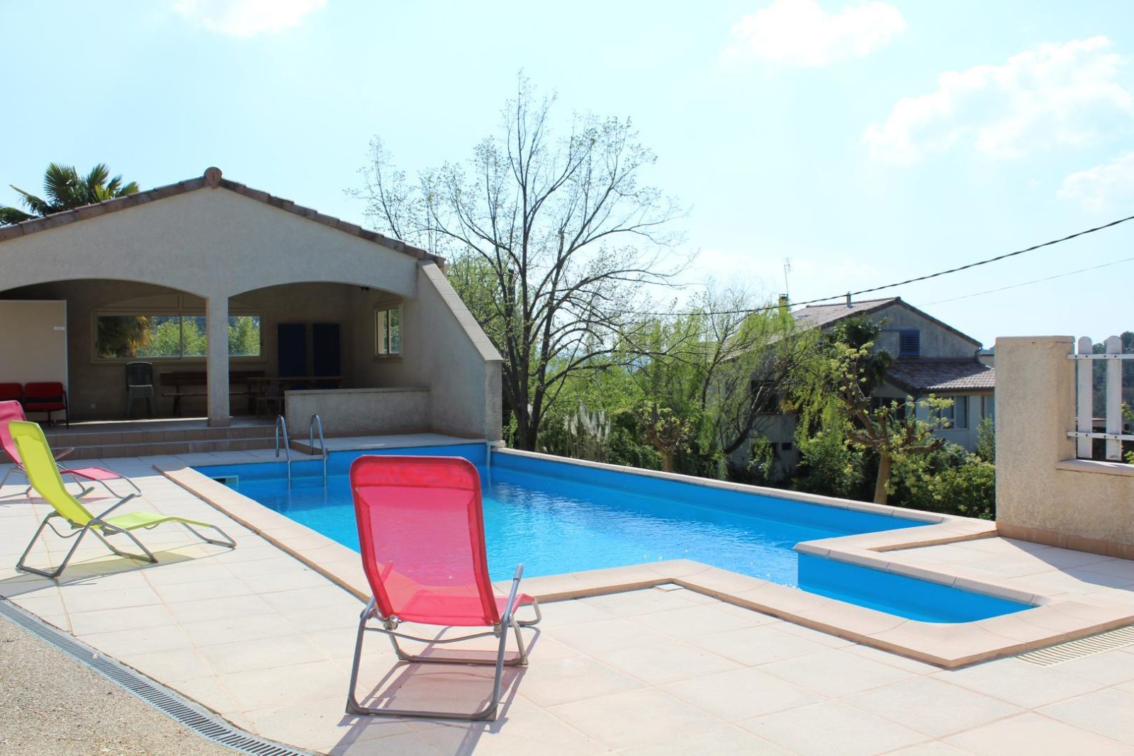 Lovely, self contained single level gîte with great view of surrounding countryside. Very comfortable accommodation. 2km from beautiful, medieval village of Largentière and from Montréal. Living room, lounge area (leather sofa, TV), fitted kitchen area, 2 bedrooms (double bed) (2 single beds), shower room, utility room, WC. Warm/cool air system. Covered terrace, set of boules. Swimming pool shared with owner.
